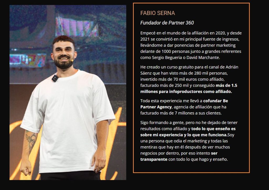El principal impulsor es Fabio Serna, un emprendedor con más de una década de trayectoria, reconocido por transformar ideas en proyectos reales y rentables. Fabio comenzó en el mundo de la afiliación en 2020 y, desde 2021, el partner marketing se convirtió en su principal fuente de ingresos. Ha invertido más de 70.000 euros en campañas de afiliados, ha facturado más de 250.000 euros como afiliado y ha generado más de 1,5 millones de euros para infoproductores con los que ha trabajado. Además, es cofundador de Be Partner Agency, una agencia de afiliación que ha facturado más de 7 millones de euros para sus clientes y más de 3 millones de euros para sus afiliados.
