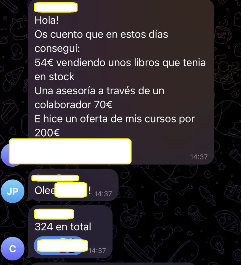 - Grupo privado de Telegram → Aquí está Adrián en el día a día, junto con el resto de alumnos. Puedes compartir ejercicios, hacer preguntas, comentar tus avances. Y lo mejor: aprendes también de lo que le pasa a otros.